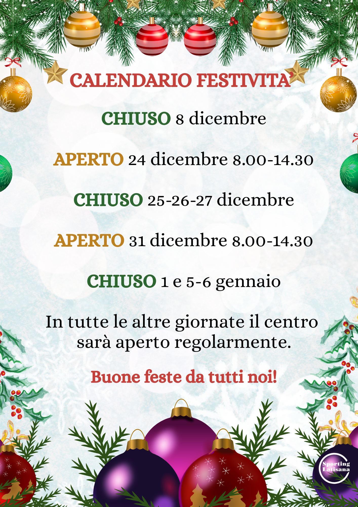 ORARIO DI APERTURA DEL CENTRO SPORTIVO